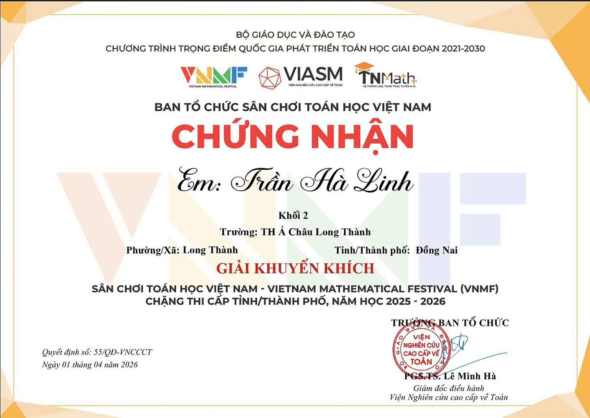 Trường Á Châu Long Thành tự hào chúc mừng các em học sinh đã đạt thành tích đáng ghi nhận tại Sân chơi Toán học Việt Nam – Vietnam Mathematical Festival (VNMF) năm học 2025 – 2026. Đây là một trong những sân chơi trí tuệ uy tín, tạo cơ hội cho học sinh trên toàn quốc thể hiện năng lực tư duy, khả năng giải quyết vấn đề cũng như nuôi dưỡng niềm đam mê với Toán học.