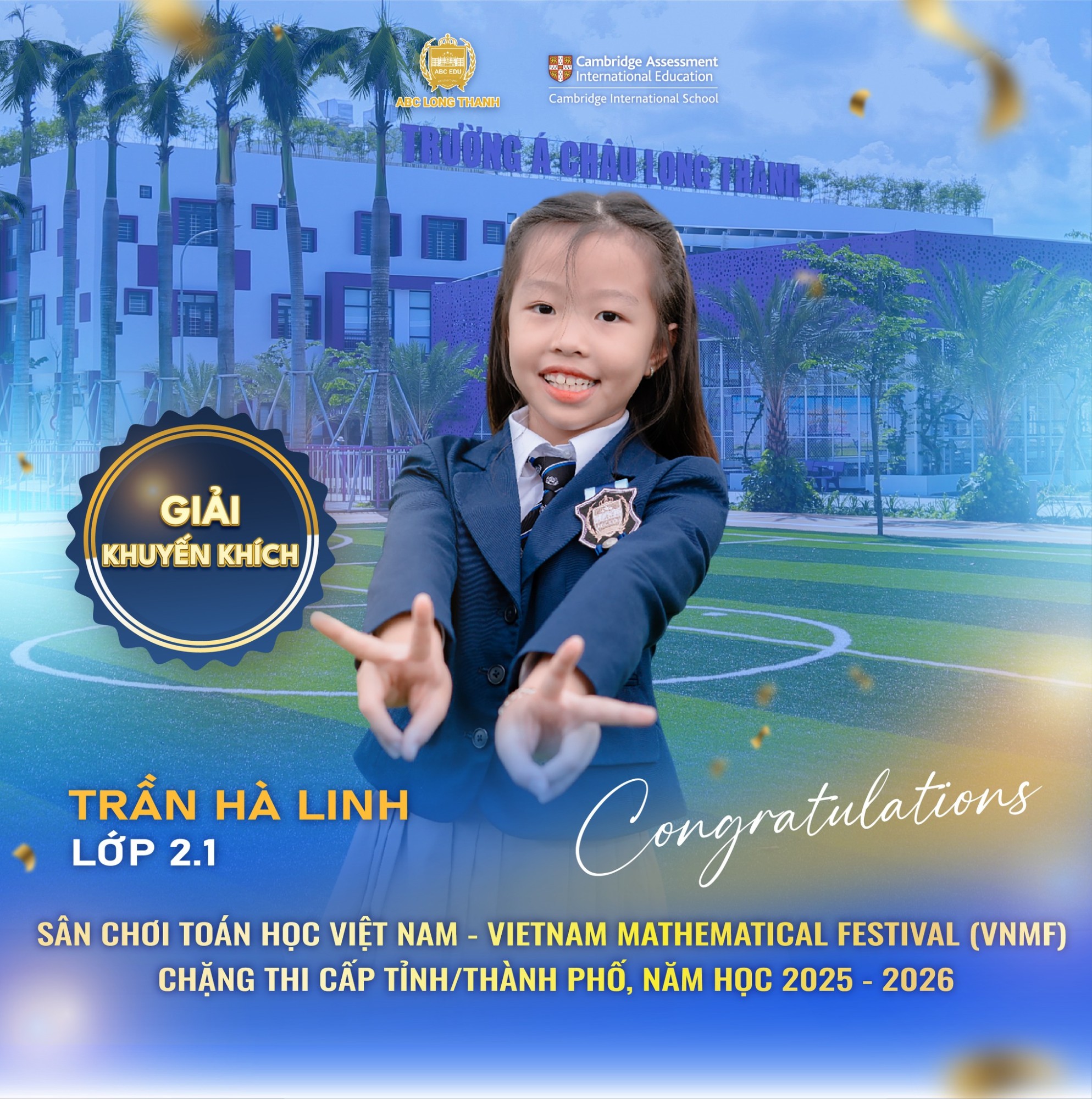 Một lần nữa, Trường Á Châu Long Thành xin gửi lời chúc mừng đến em Trần Hà Linh và gia đình. Chúc em sẽ luôn giữ vững tinh thần học hỏi, tự tin tỏa sáng và gặt hái thêm nhiều thành công trên con đường chinh phục tri thức.