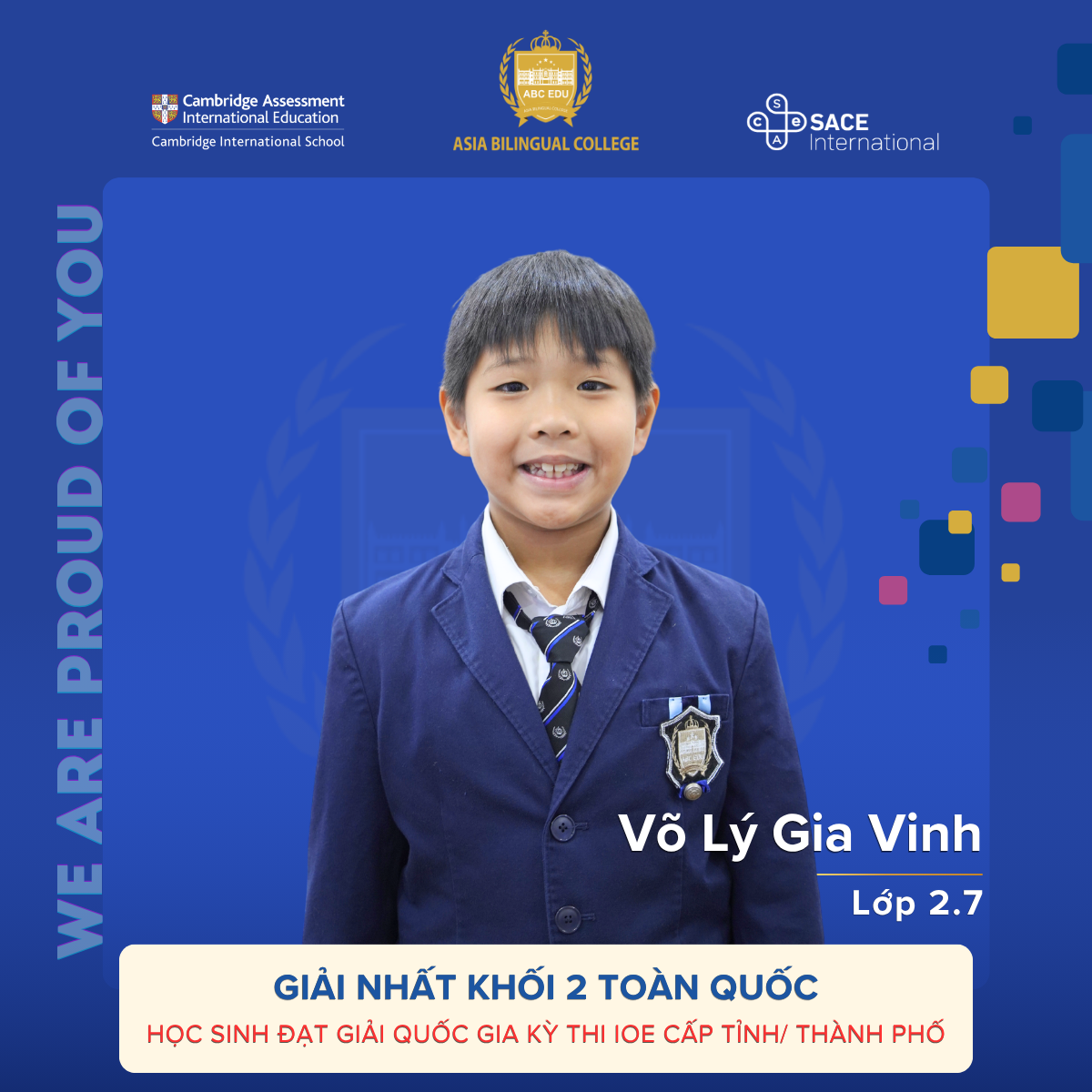 Trường TH-THCS-THPT Song ngữ Á Châu tự hào vinh danh những học sinh xuất sắc đã ghi dấu ấn nổi bật tại Kỳ thi IOE cấp Tỉnh/Thành phố. Đây không chỉ là một thành tích đáng tự hào mà còn là minh chứng rõ nét cho năng lực học tập vượt trội, sự kiên trì và tinh thần chinh phục tri thức của các em trên hành trình hội nhập quốc tế.