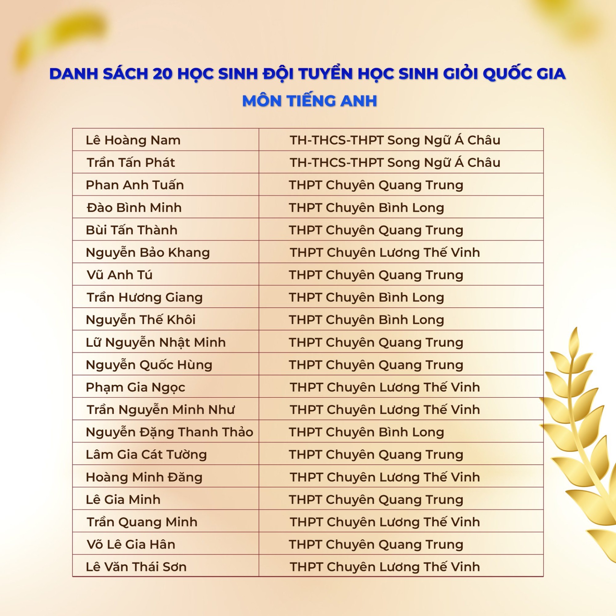 Trong danh sách gồm nhiều học sinh đến từ các trường chuyên danh tiếng, Trường TH - THCS - THPT Song ngữ Á Châu tự hào là trường tư thục duy nhất tại Đồng Nai có hai học sinh được chọn vào đội tuyển Quốc gia môn Tiếng Anh. Hai gương mặt tiêu biểu đó là: