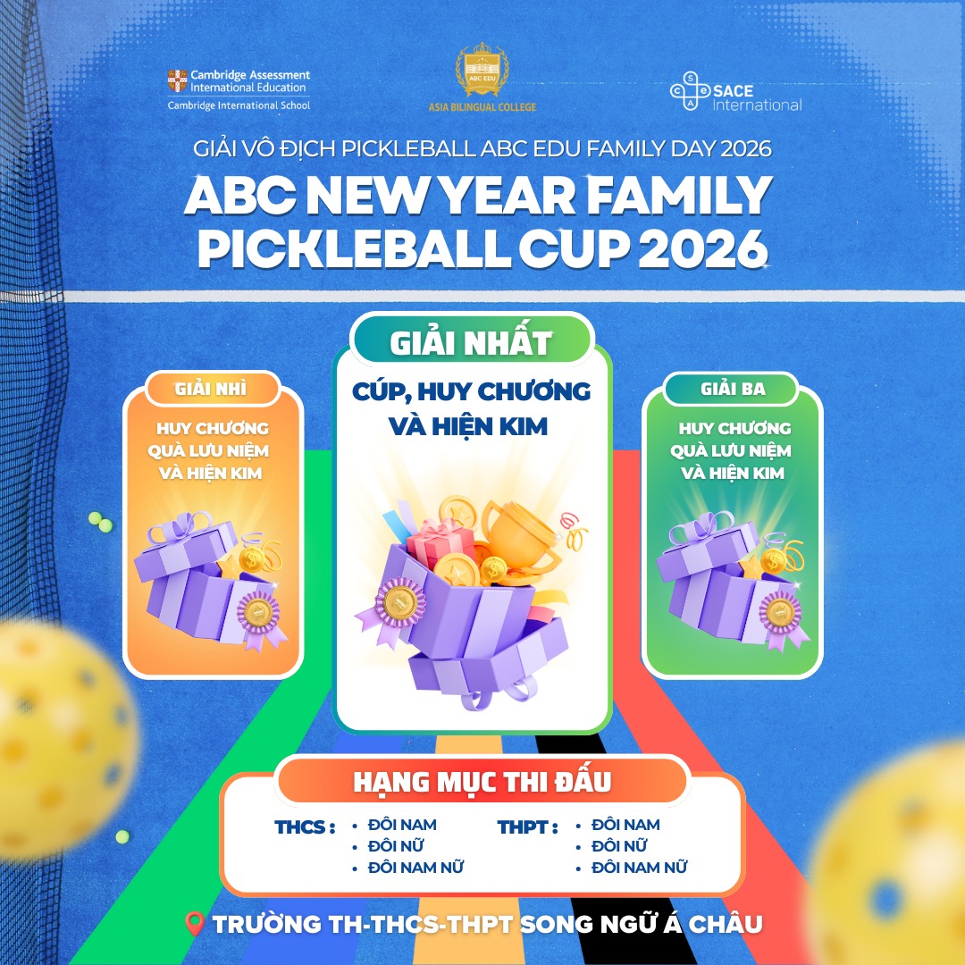 Với mong muốn tạo nên một không gian giao lưu lành mạnh, Trường TH-THCS-THPT Song ngữ Á Châu chính thức tổ chức ABC New Year Family Pickleball Cup 2026 – giải đấu thể thao dành cho Phụ huynh và học sinh, nằm trong chuỗi hoạt động gắn kết cộng đồng ABC EDU Family Cup.