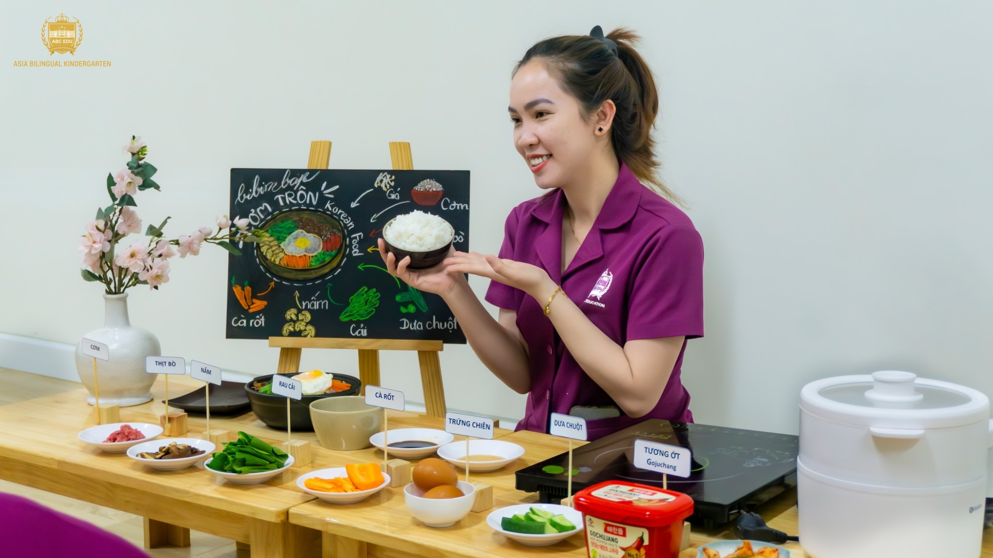 Vừa qua, không gian lớp học tại Trường Mầm non Á Châu Long Thành trở nên rộn ràng hơn với hoạt động trải nghiệm làm Bibimbap – món cơm trộn truyền thống nổi tiếng của Hàn Quốc. Dưới sự hướng dẫn tận tình của giáo viên, các bé cùng nhau chuẩn bị những nguyên liệu tươi ngon, quan sát màu sắc đa dạng của rau củ và tham gia vào quá trình trộn món ăn một cách vui vẻ, hào hứng.