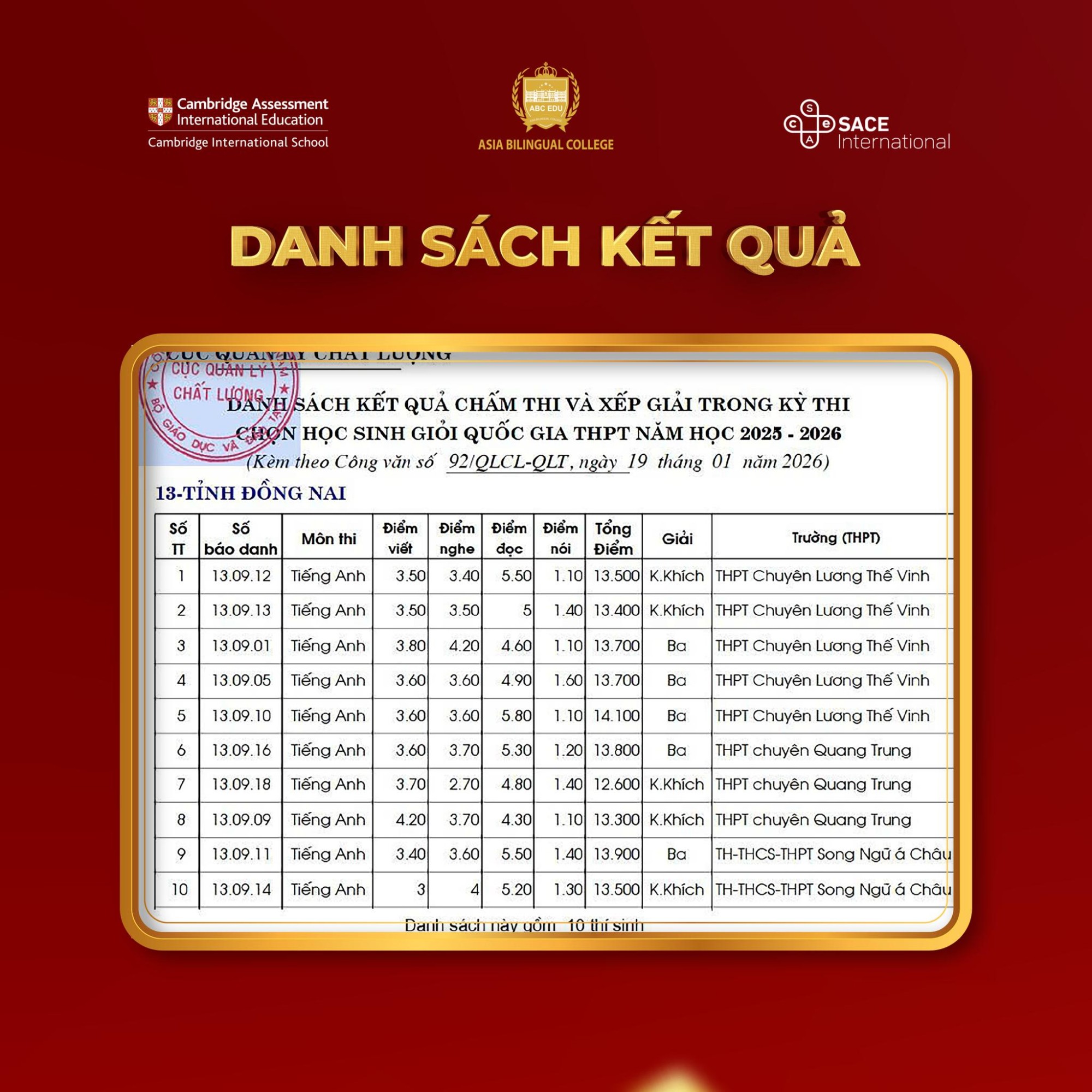 Trường Song ngữ Á Châu – ABC EDU tự hào là ngôi trường tư thục duy nhất tại Đồng Nai có học sinh vượt qua các vòng tuyển chọn khắt khe, chính thức góp mặt trong đội tuyển và đạt giải tại Kỳ thi chọn Học sinh Giỏi Quốc gia THPT.