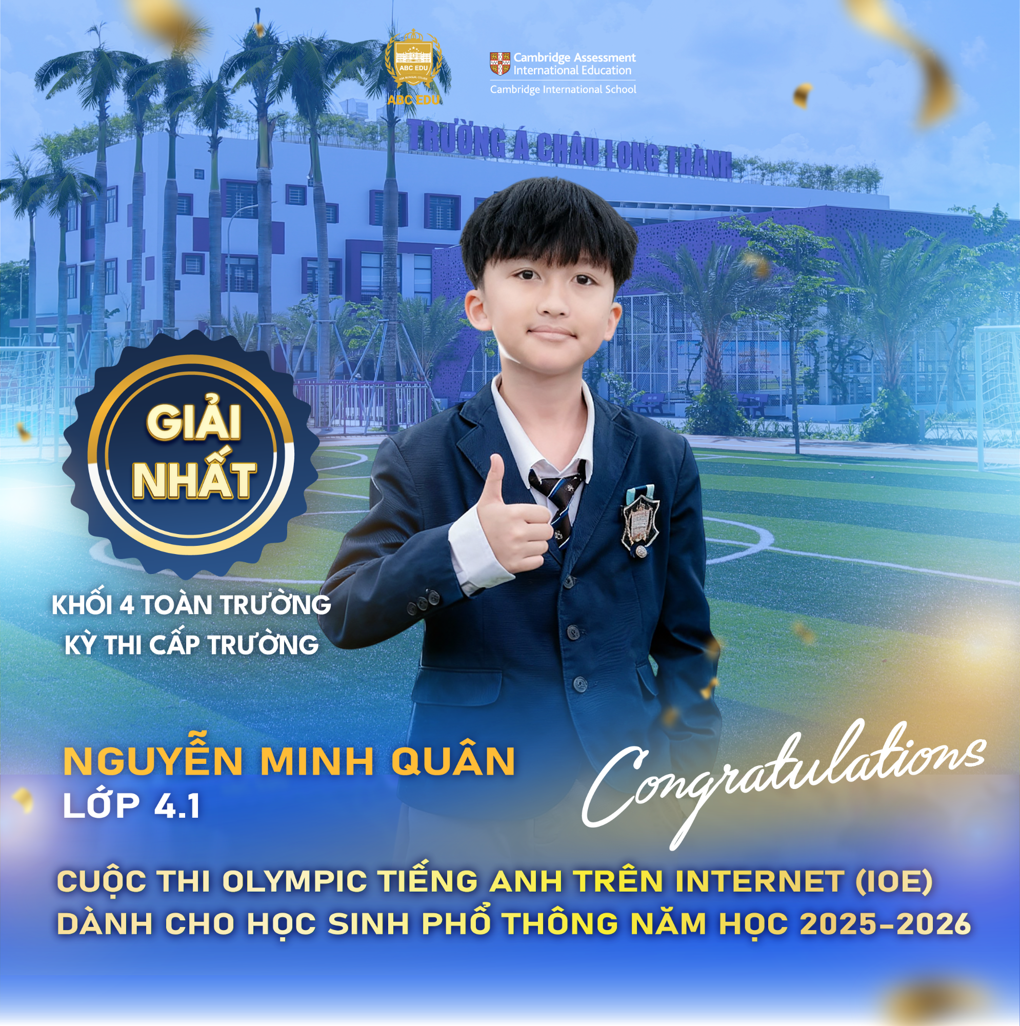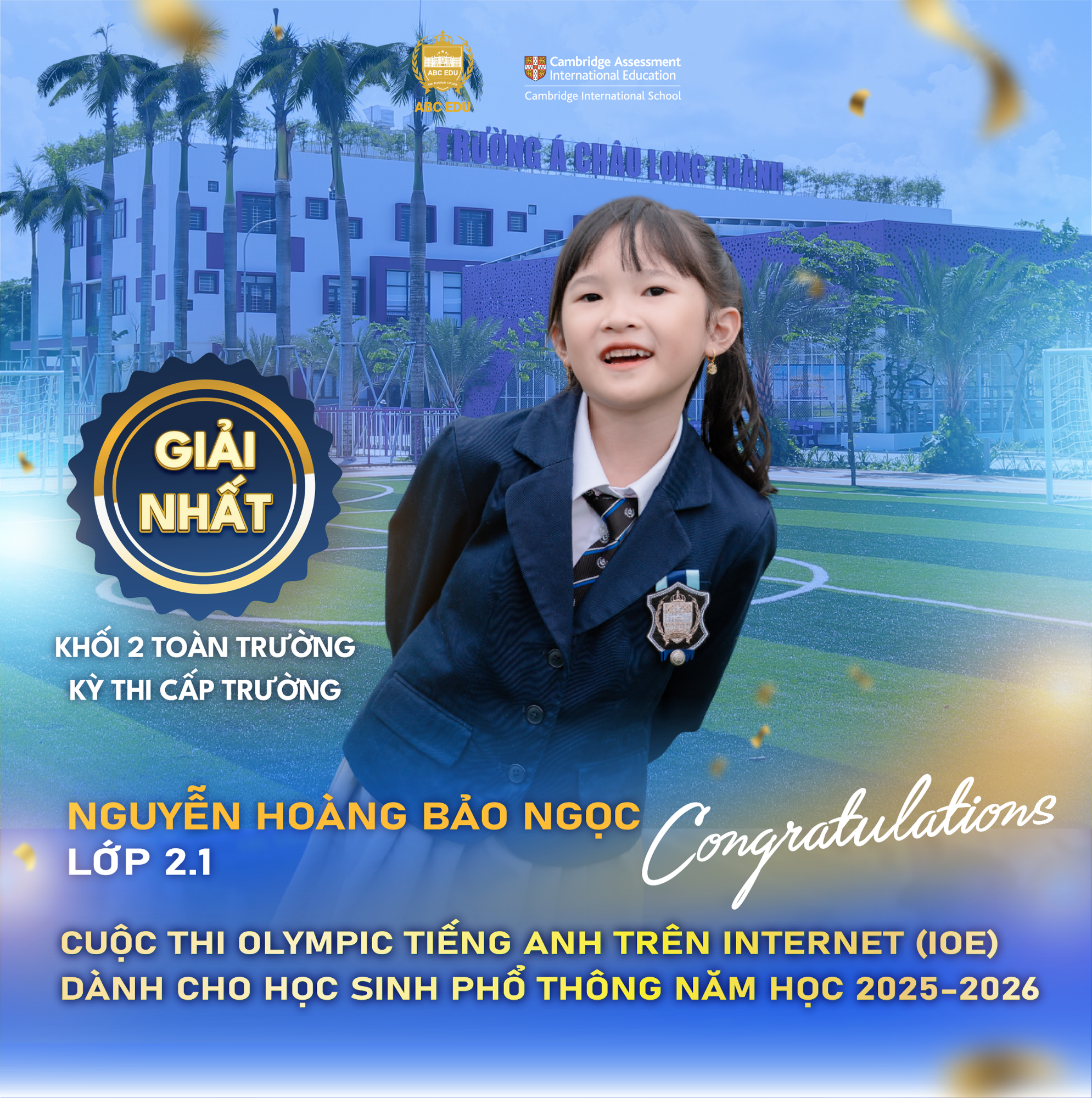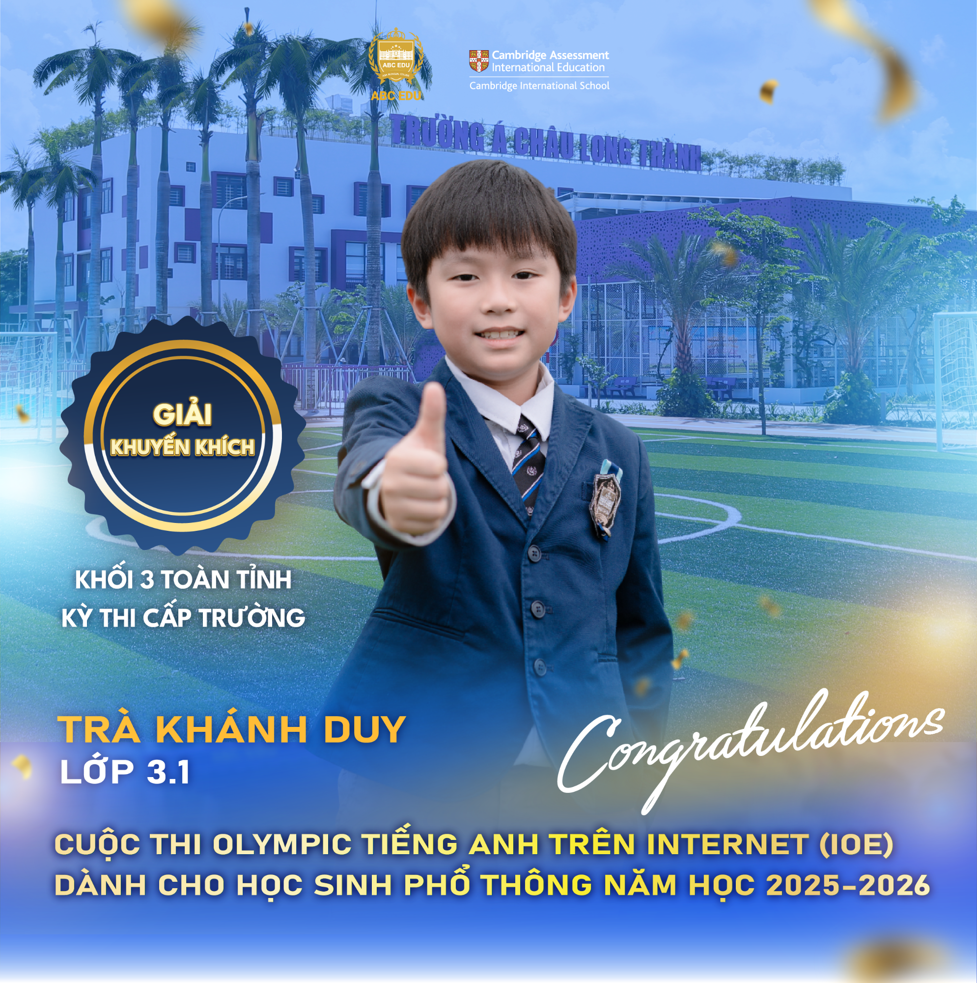 Trường Á Châu Long Thành trân trọng chúc mừng các em học sinh đã xuất sắc đạt thành tích ấn tượng tại Cuộc thi Olympic Tiếng Anh trên Internet (IOE) dành cho học sinh phổ thông năm học 2025–2026. Những kết quả đáng tự hào này không chỉ ghi dấu nỗ lực học tập bền bỉ của các em mà còn khẳng định chất lượng đào tạo tiếng Anh bài bản, hiệu quả tại nhà trường.