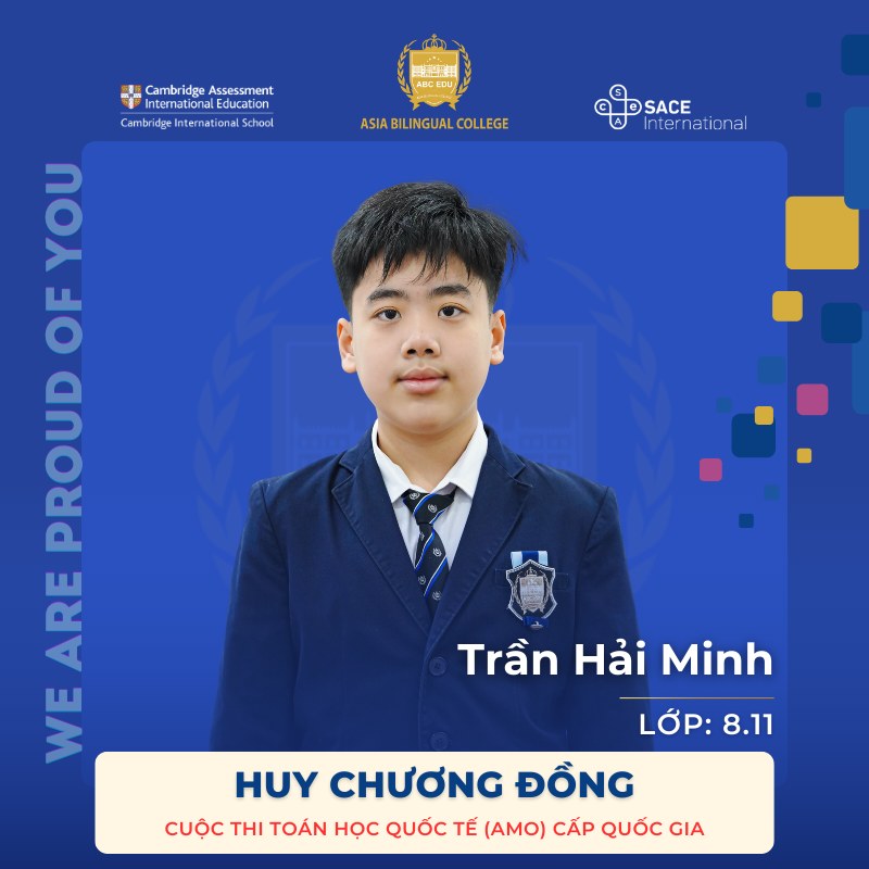 Trường Song ngữ Á Châu tự hào vinh danh những thành tích nổi bật của học sinh tại Kỳ thi Toán Quốc tế AMO 2025 vòng Quốc gia. Đây là một trong những sân chơi học thuật uy tín, quy tụ nhiều thí sinh có năng lực vượt trội trên toàn quốc. Với sự nỗ lực bền bỉ và tinh thần quyết tâm, các ABCers đã xuất sắc ghi tên mình vào bảng vàng thành tích, mang về niềm vui và niềm tự hào lớn lao cho Nhà trường.